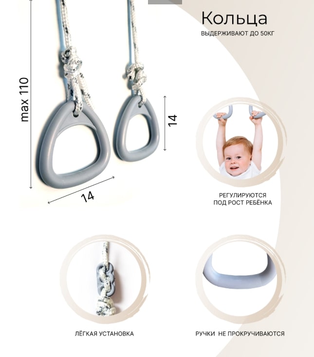 В детский спортивный комплекс входит навесное оборудование — веревочная лестница, канат, гимнастические кольца треугольной формы, которые не проворачиваются во время занятий.