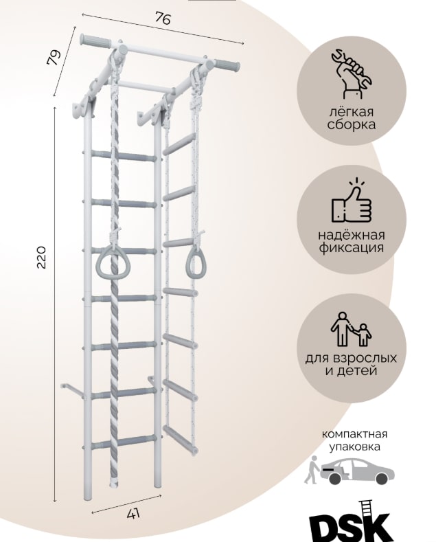 ДСК Romana DSK 1.0 представляет собой сборно-разборную каркасную конструкцию из металлических труб, закрепленную к стене. Основным элементом комплекса является вертикальная «гимнастическая лестница».
