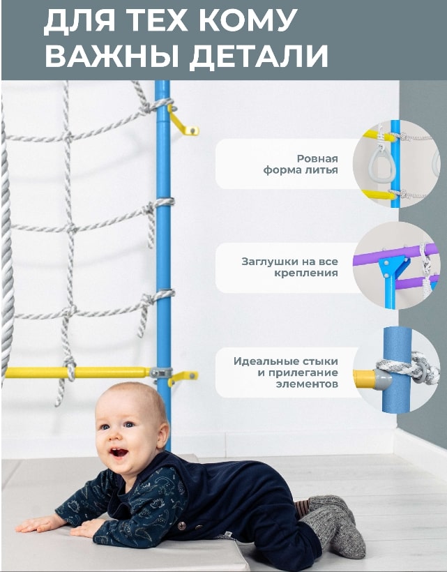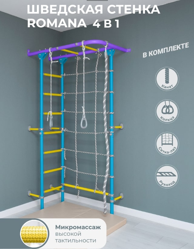 У детского спортивного комплекса ROMANA S4 оригинальная конструкция и расположение элементов. На рукоход можно разместить разнообразное навесное оборудование. В комплекте предусмотрены канат, кольца и канатный лаз шириной 80 см из крепкого шнура. Конструкция выдерживает вес до 100 кг (нагрузка при испытаниях — 200 кг). Ступени лестницы обладают массажным эффектом, развивая мелкую моторику.Комплектация: канат, кольца гимнастические, веревочный лаз, рукоход.