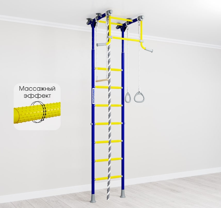ROMANA R2 быстро собирается и устанавливается. Ширина лестницы - 49 см, ступени массажные, благодаря чему исключается скольжение ног и рук, стимулируется общая моторика. В комплекте в наличии все самое популярное навесное оборудование — трапеция, кольца и канат.