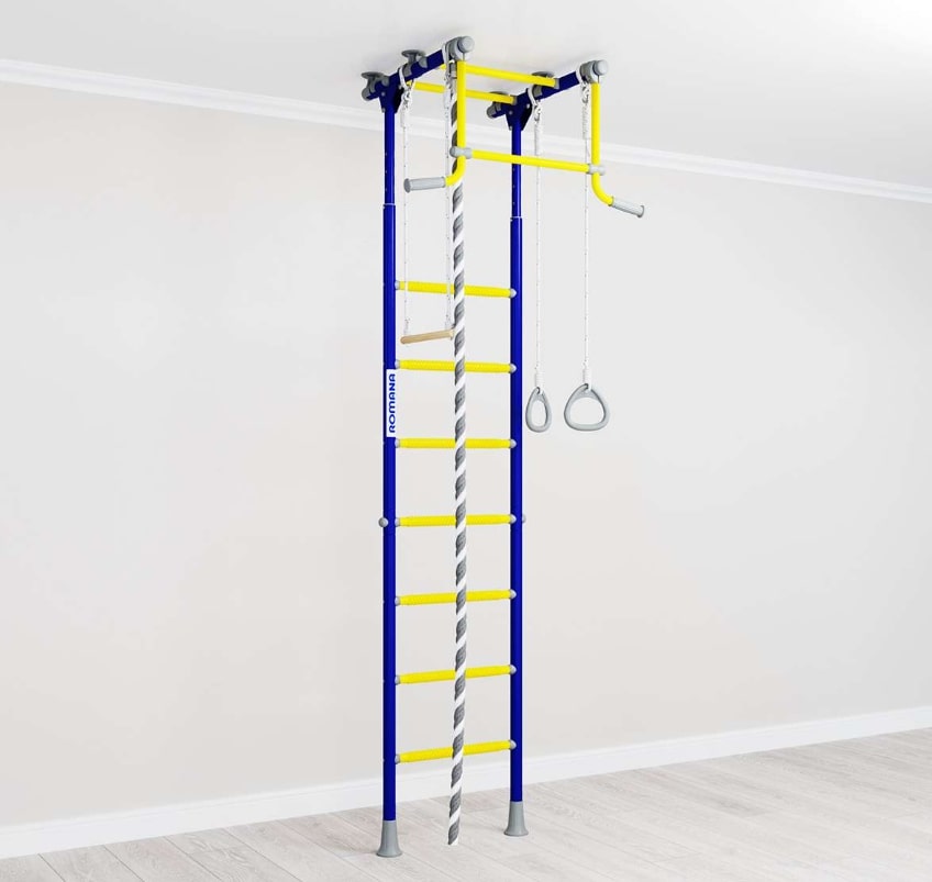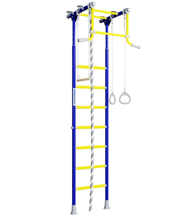 Детский спортивный комплекс ROMANA R2 - выбор для владельцев домов и квартир, которые не хотят сверлить стены для установки шведской стенки. Комплекс устанавливается враспор, что означает, что его можно переставлять в любую точку квартиры закрепив между полом и потолком. При этом допустимый вес - 100 кг (испытания проводятся при весе 200 кг).