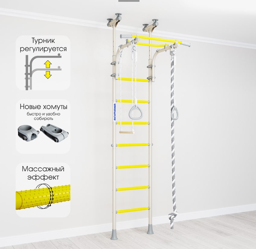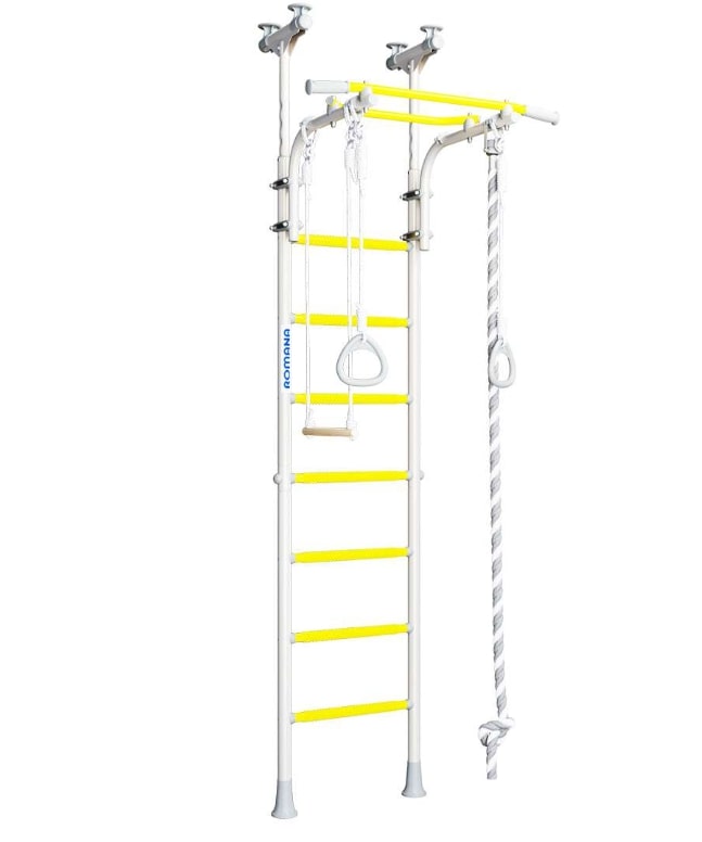 Детский спортивный комплекс ROMANA R5 Kometa - современная шведская стенка с возможностью установки враспор к полу и потолку. Не нужно сверлить стену и крепить к ней раму. Металлокаркас стенки рассчитан на вес в 100 кг (испытан нагрузкой в 200 кг).В ROMANA R5 Kometa регулируемый по высоте турник, который крепится на надежные современные хомуты. Его можно зафиксировать на нужную детям высоту. Ребенок растет - можно переставить турник повыше. Предусмотрены специальные массажные ступени для лестниц, они исключают скольжение ног и рук и развивают мелкую моторику.