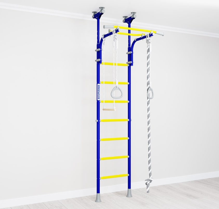 Детский спортивный комплекс ROMANA R5 Kometa - современная шведская стенка с возможностью установки враспор к полу и потолку. Не нужно сверлить стену и крепить к ней раму. Металлокаркас стенки рассчитан на вес в 100 кг (испытан нагрузкой в 200 кг).В ROMANA R5 Kometa регулируемый по высоте турник, который крепится на надежные современные хомуты. Его можно зафиксировать на нужную детям высоту. Ребенок растет - можно переставить турник повыше. Предусмотрены специальные массажные ступени для лестниц, они исключают скольжение ног и рук и развивают мелкую моторику.