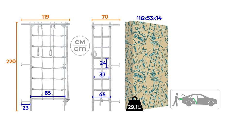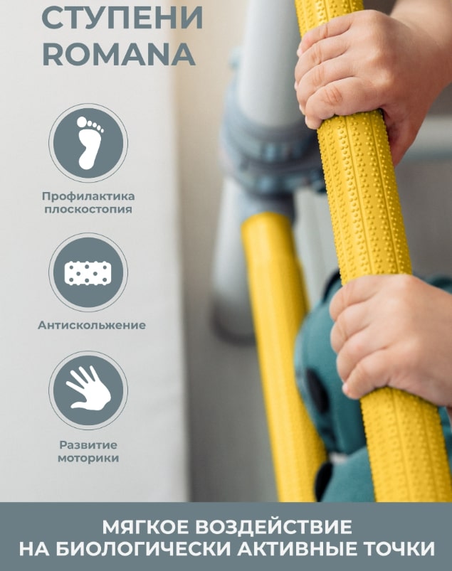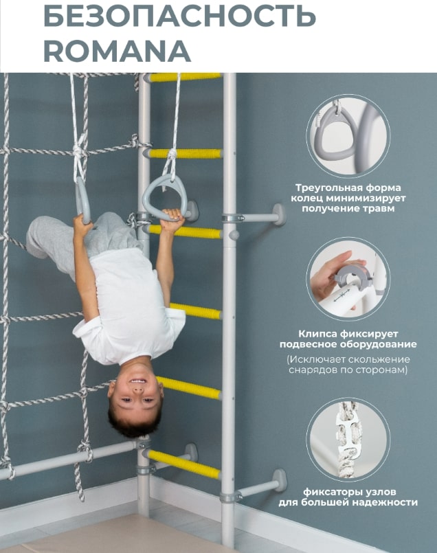 У детского спортивного комплекса ROMANA S4 оригинальная конструкция и расположение элементов. На рукоход можно разместить разнообразное навесное оборудование. В комплекте предусмотрены канат, кольца и канатный лаз шириной 80 см из крепкого шнура. Конструкция выдерживает вес до 100 кг (нагрузка при испытаниях — 200 кг). Ступени лестницы обладают массажным эффектом, развивая мелкую моторику..