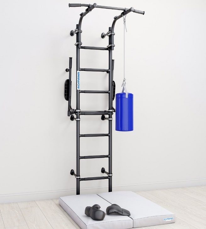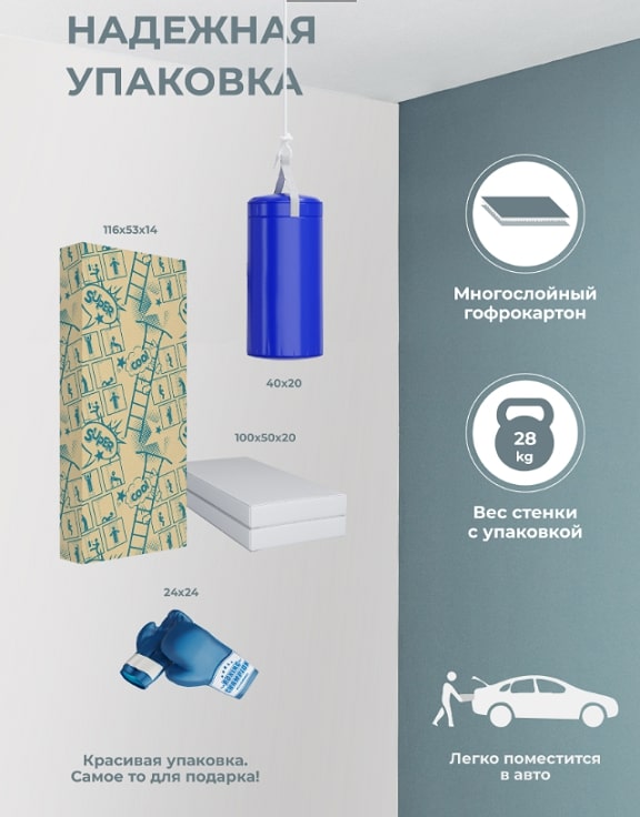Комплектация: турник подвижный, брусья откидные, мешок боксерский, перчатки боксерские, мат 100х100х10Характеристика: