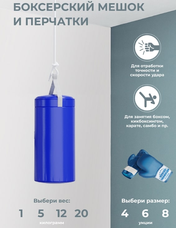 - Материал: металл, мат,мешок боксерский-винилискожа (наполнитель-поролон), перчатки боксерские-полиуретан, пенополиэтилен