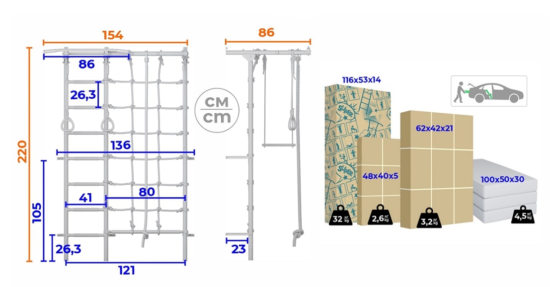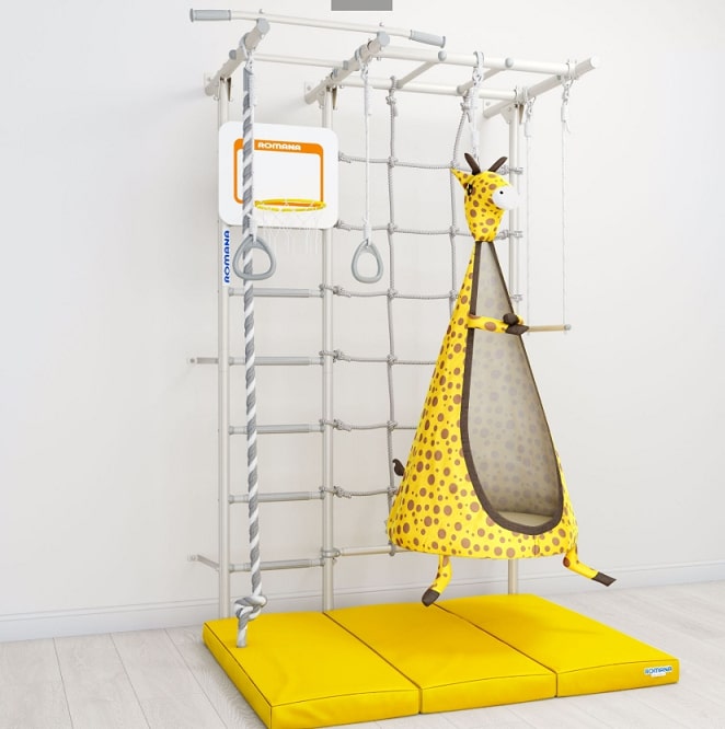 Шведская стенка станет не только отличным дополнением для игровой зоны детей, но и полезным тренажером для всех членов семьи. Специальные массажные ступени мягко воздействуют на ноги, улучшая кровообращение и уменьшая усталость, а также помогают предотвратить плоскостопие. Безопасный пластиковый материал, из которого изготовлены ступени, обладает противоскользящими свойствами, что обеспечивает высокий уровень комфорта во время тренировок.В набор входит мат толщиной 100 мм, который создает безопасное пространство для физической активности. Конструкция стенки складывается в три раза, что делает ее удобной для хранения и транспортировки. Шведская стенка Romana представляет собой комплексный набор оборудования, включающий канат, трапецию, веревочный лаз, рукоход, кольца, баскетбольный щит и уютный гамак «Зебра». Разнообразие этих элементов значительно расширяет функциональные возможности шведской стенки и способствует всестороннему физическому развитию.