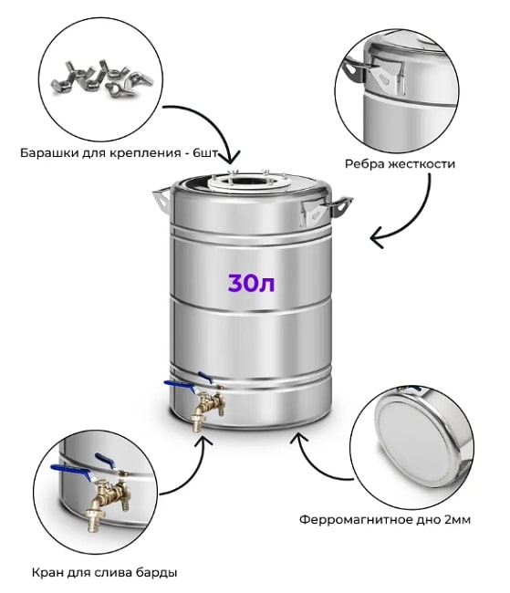 Приобретая модель в сборке с электрическим ТЭНом и регулятором мощности, вы можете проводить дистилляцию, установив её на пол, что является плюсом для тех, кто не может поставить устройство на плиту, поскольку этому мешает вытяжка.