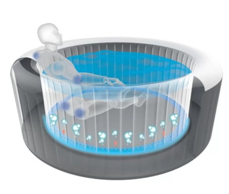 Бассейн имеет 140 аэро-форсунок по периметру дна, которые при помощи мощного воздушного насоса подают 140 тёплых пузырьковых струек, снимающих стресс, повышающих тонус всего организма и улучшающих кровообращение. Энергопотребление 800 Вт. Гидромассажная система очень тихая, что очень важно, когда хочется расслабиться.