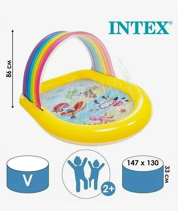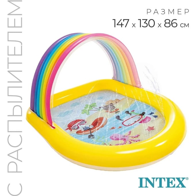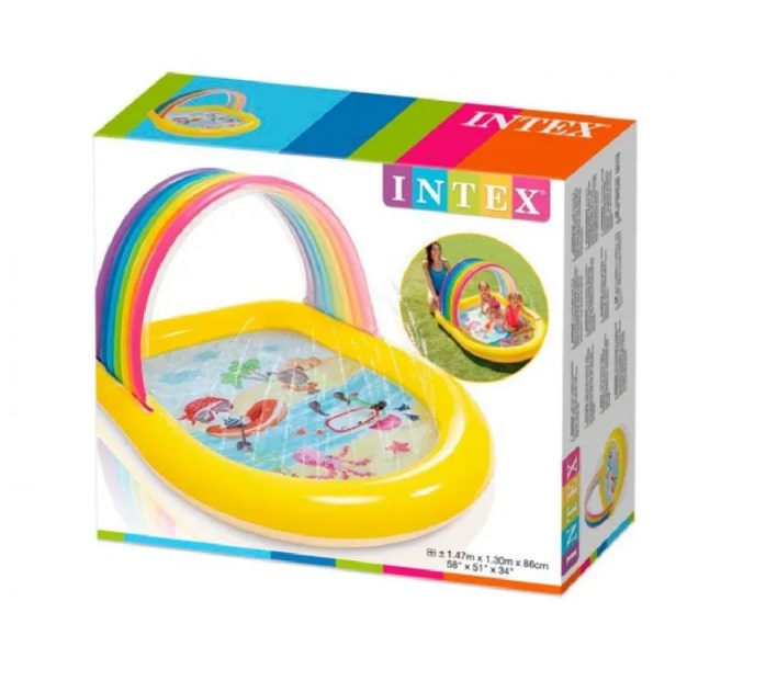 Intex Rainbow Arch Spray 57156 – детский надувной бассейн-радуга с навесом в виде яркой весёлой радуги и распылителями-фонтанчиками. Бортики бассейна невысокие, что позволяет родителям следить за крохой даже издали.Детский бассейн "Радуга" Intex 57156 - это отличный выбор для вашего маленького ангелочка. Яркий, необыкновенно позитивный надувной бассейн подарит массу положительных эмоций малышам и оживит ваш участок. Чудные картинки украшают дно бассейна глубиной 10 см. Надувной навес для защиты от прямых солнечных лучей выполнен в виде радуги. Изюминкой центра является множество фонтанчиков, расположенных по периметру. Для их работы нужно подключить к бассейну садовый шланг и подать воду, и заливистый детский смех не заставит себя ждать! Материал, из которого Интекс делают бассейн - качественный винил. Он не вызывает аллергию, а на ощупь очень мягкий. Не имеет посторонних запахов. Технические характеристики: