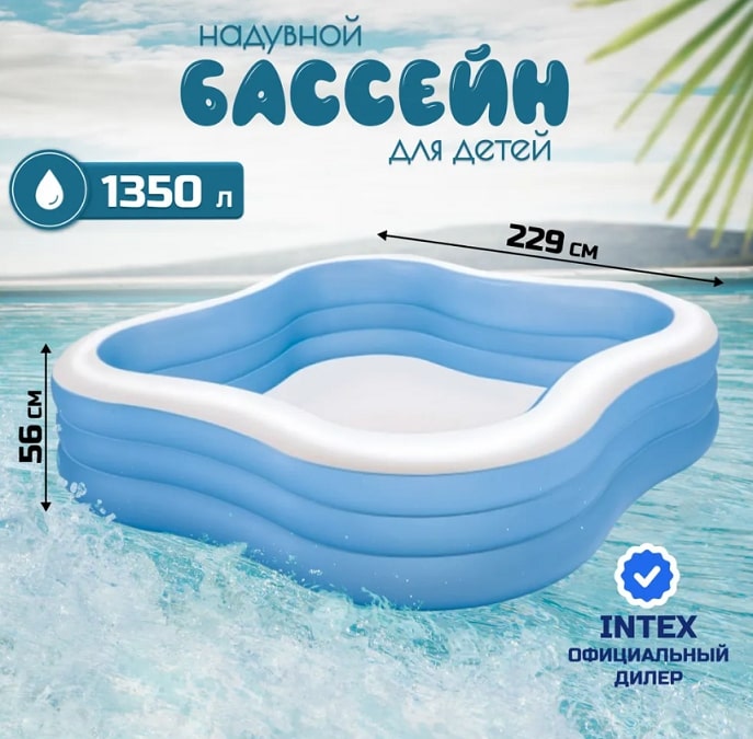 Intex 57495NP – замечательный надувной бассейн для всей семьи. Уникальная квадратная форма обеспечивает максимальное игровое пространство, а широкие боковые стенки – дополнительный комфорт и устойчивость. Форма волны делает этот бассейн веселым и интересным для всех.- Тип товара: Надувной бассейн