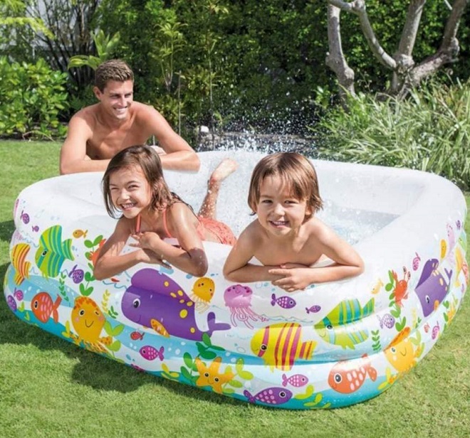 Бассейн квадратный сделан из прочного винила (ПВХ). Крепкий и качественный материал толщиной 0.3 мм обеспечивает высокую устойчивость к повреждениям. Имеет 3 воздушные камеры с двойными клапанами.Для удобства имеется сливной клапан. В нем могут купаться несколько детей одновременно.