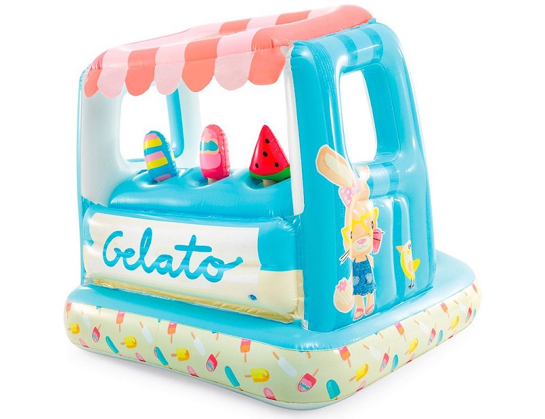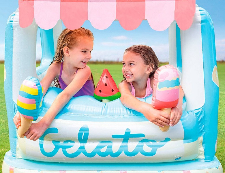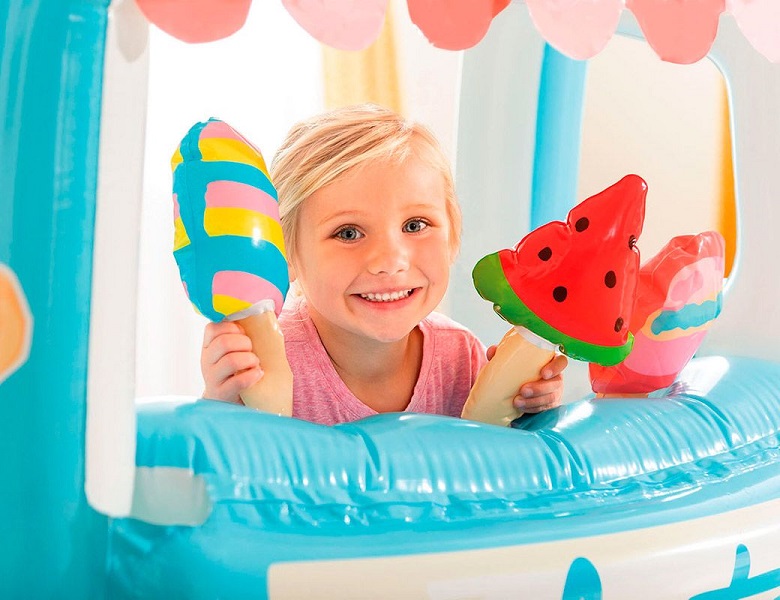 Игровой центр 48672 в форме киоска с мороженым с бассейном. Палатка детская игровая большого размера, бассейн мягкий с удобными широкими высокими бортами.В такой палатке для детей интересно играть ролевые игры - представлять себя продавцом мороженого. Игровой комплекс можно использовать на открытом воздухе, наполненном водой и в помещении. Бассейн оснащён крышей для защиты от солнца и 3 надувными игрушками в виде мороженого. Детям понравится сидеть играть в бассейне пуская кораблики, купая кукол и играя с другими игрушками для воды. Надувной бассейн подходит для мальчиков и для девочек. Объем воды в бассейне небольшой, всегда можно легко слить воду и налить новую.