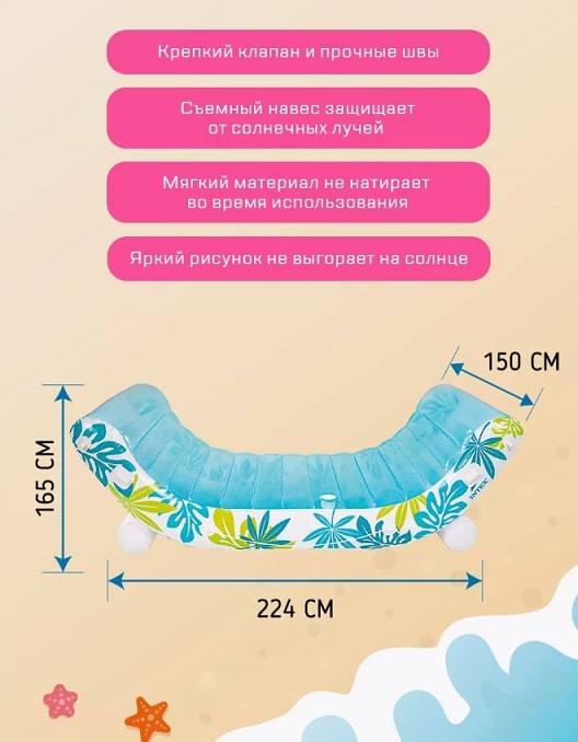 Матрас INTEX с навесом изготовлен из прочного винила, который гарантирует долговечность и устойчивость к повреждениям. Его эргономичный дизайн обеспечивает максимальный комфорт, а встроенные подушки и подлокотники позволяют расслабиться и наслаждаться отдыхом. Легкий и компактный в сложенном виде, этот матрас с навесом легко транспортируется и хранится. Быстрое надувание и сдувание обеспечивают максимальное удобство использования. Наслаждайтесь беззаботным отдыхом на воде с матрасом-лаунджем с навесом от INTEX — вашим личным островом комфорта и защиты от солнца.Уникальная особенность данного матраса — встроенный навес, который обеспечивает надежную защиту от солнца, создавая приятную тень и защищая вашу кожу от вредных UV-лучей.
