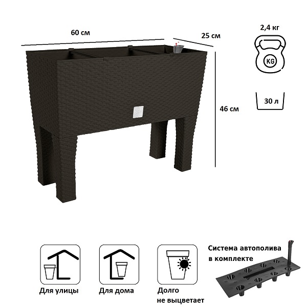 Кашпо с автополивом Rato Case High является замечательным украшением садового интерьера, дома, зоны отдыха. Изделие выполнено с имитацией под натуральный ротанг и имеет две устойчивые ножки, что делает его стильным элементом декора. В комплект кашпо с автополивом Rato Case High входит 2 предмета: декоративная емкость и специальная система автополива, которая поможет заботить о растениях с еще большим удовольствием.Комплектация: 2 предмета (система автополива + декоративная емкость).