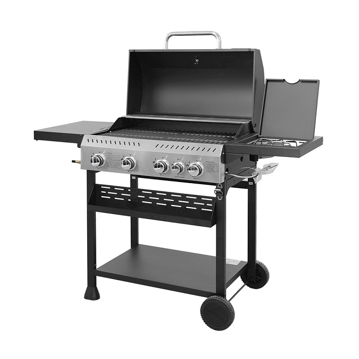 Гриль оснащен газовыми конфорками, общей номинальной мощностью 14,5 кВт. Он не требует углей или дров, что делает его более удобным в эксплуатации. Вам не нужно беспокоиться о разжигании огня, а достаточно просто подключить баллон с газом (Бутан (G30) 28-30 мбар или Пропан (G31) 37 мбар) и зажечь огонь с помощью встроенного пьезоподжига. Это экономит время и силы.