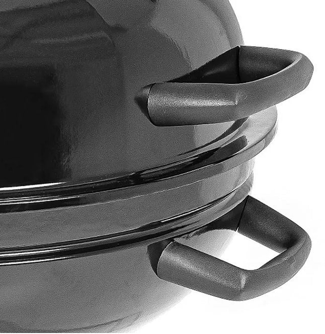 Накрывается крышкой. На крышке и жаровне есть ручки которые не нагреваются в процессе приготовления пищи.
