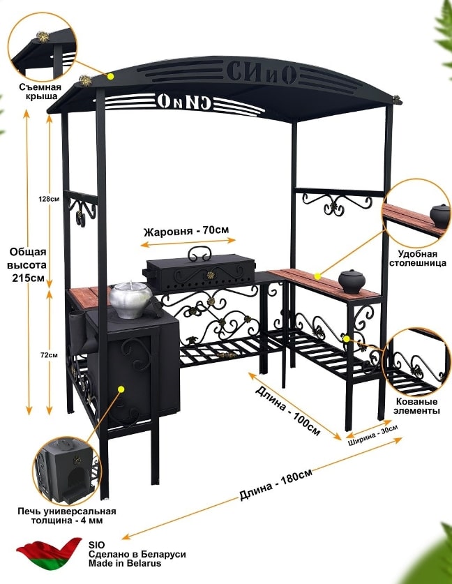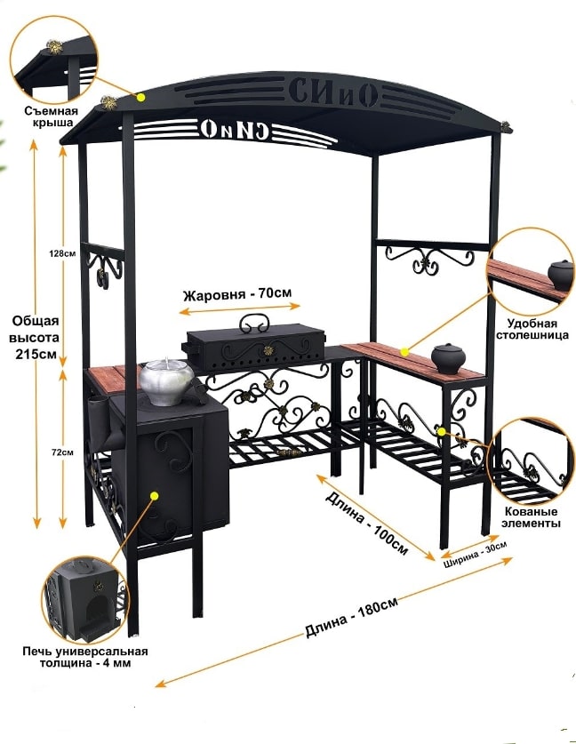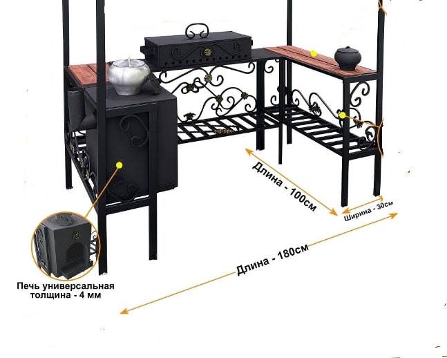 Мангал-беседка Царский предоставляют удобное и функциональное пространство для проведения отдыха на природе и позволит приготовить настоящие шедевры кулинарии.Центральным местом является жаровня, которая предназначена для готовки на шампурах. Печь универсальная для этого мангала изготавливается из стального листа толщиной 4мм.