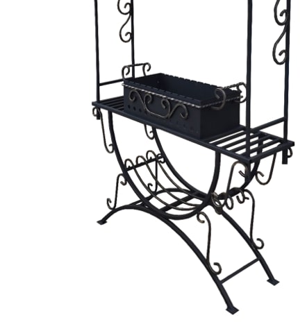 Сам мангал декорирован коваными завитками, что делает его красивым дополнением в декоре вашего двора или места для отдыха.