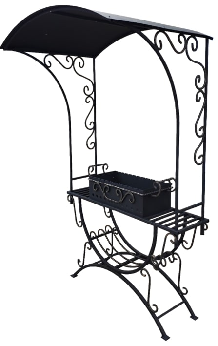 Сам мангал декорирован коваными завитками, что делает его красивым дополнением в декоре вашего двора или места для отдыха.