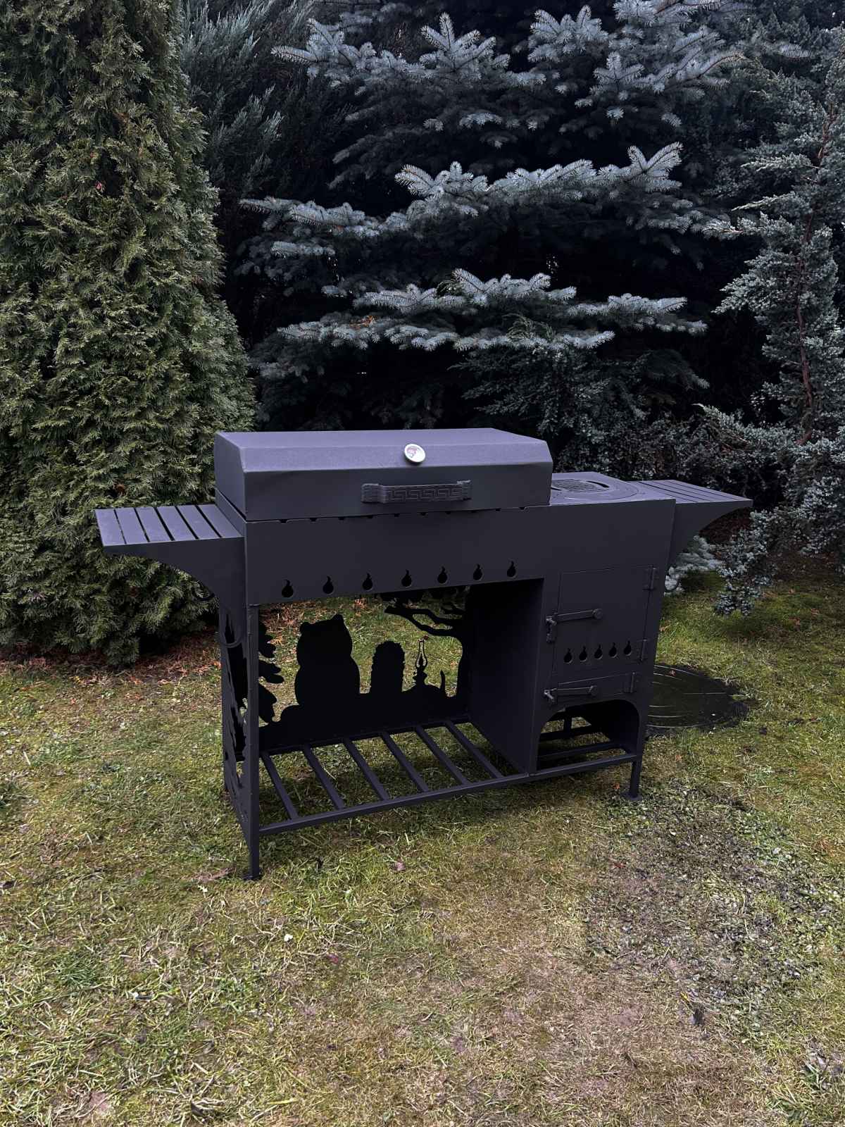 Мангальный комплекс №1 предназначен для готовки мяса, рыбы или овощей на углях на открытом воздухе с использованием шампуров, решетки и других приспособлений.Изготовлен из конструкционной стали, покрытый жаропрочной эмалью. Особенностью мангала является внешний дизайнерский вид, столик, печь универсальная. Боковые отверстия обеспечивают оптимальный приток воздуха для поддержания горения и жара углей. Нижняя полка позволяет удобно и компактно хранить все необходимые материалы и подручные средства.