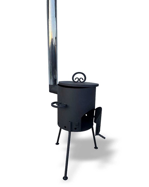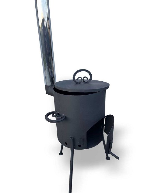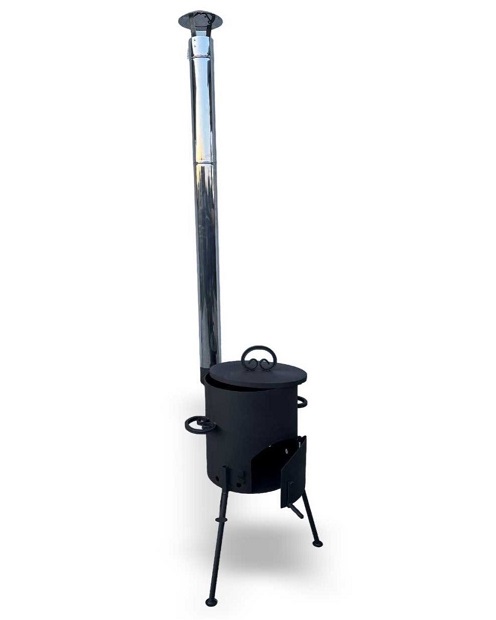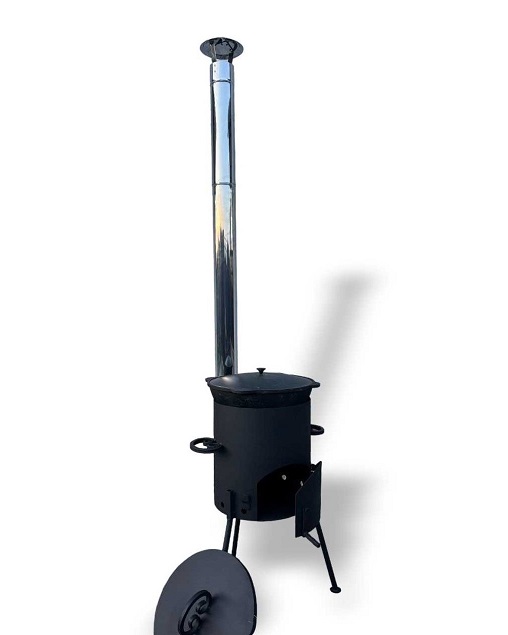 широким углом, благодаря чему топка стоит устойчиво и не будет шататься. Крышка защитит от осадков при хранении на улице что увеличит срок службы. Дымоход так же разборный и состоит из 3 секций трубы и грибка-искрогасителя особенностью является то, что он изготовлен из нержавеющей стали.