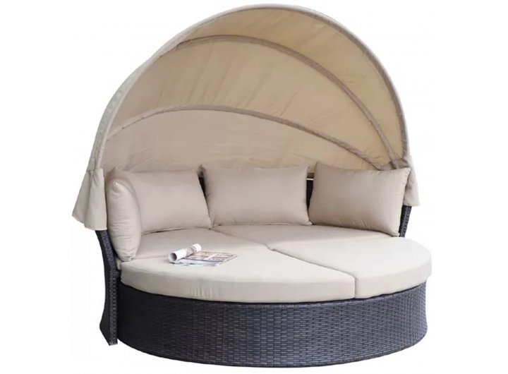 Диван состоит из 2 модулей: диван с тентом и пуф в форме полукруга.Модули комплекта могут использоваться по отдельности, в качестве самостоятельных предметов мебели или в сборе. Металлический каркас мебели оплетён высококачественным искусственным ротангом.