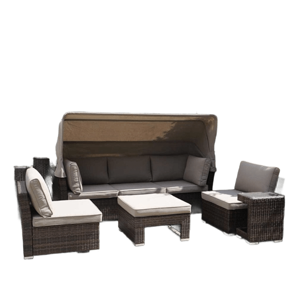 Диван траснформер с навесом. Высококачественная лоза из полиротанга серого цвета стойкая к любым атмосферным явлениям. Крепкий стальной каркас с полимерным антивандальным покрытием и отличным качеством сварки. Изделие сплетено вручную нашими мастерами под жестким контролем качества на каждом этапе производства. Лоза максимально приближена по рельефу и текстуре к естественному материалу.