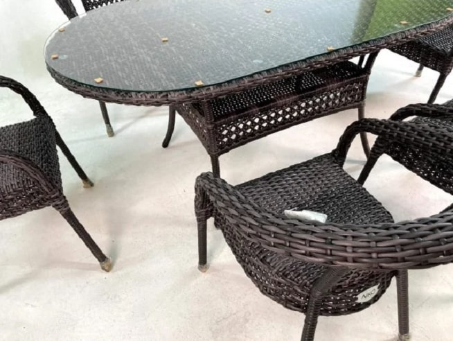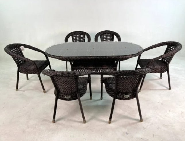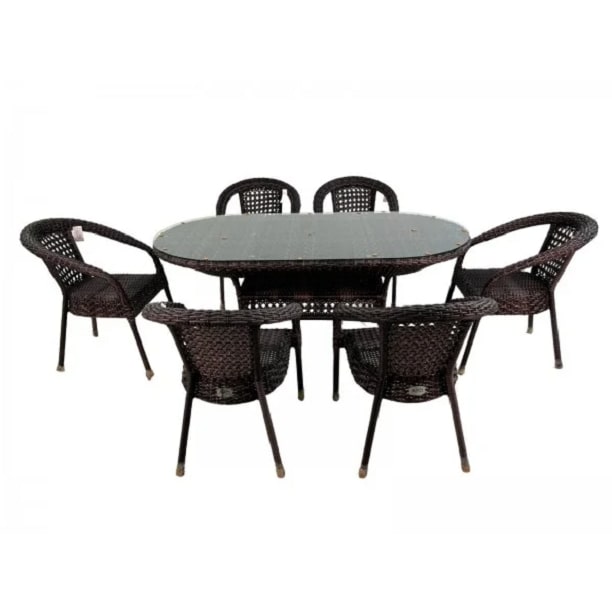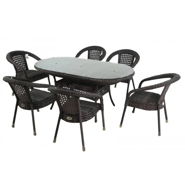 Комплект плетеной мебели из искусственного ротанга на 6 персон. Не боится влаги, прямых солнечных лучей, мороза. Не требует особого ухода. Легко моется. Рекомендованная температура эксплуатации -16/+50.В комплекте стол обеденный овальный, 6 кресел. Подушки можно приобрести отдельно. Столешница - каленое стекло 6 мм.