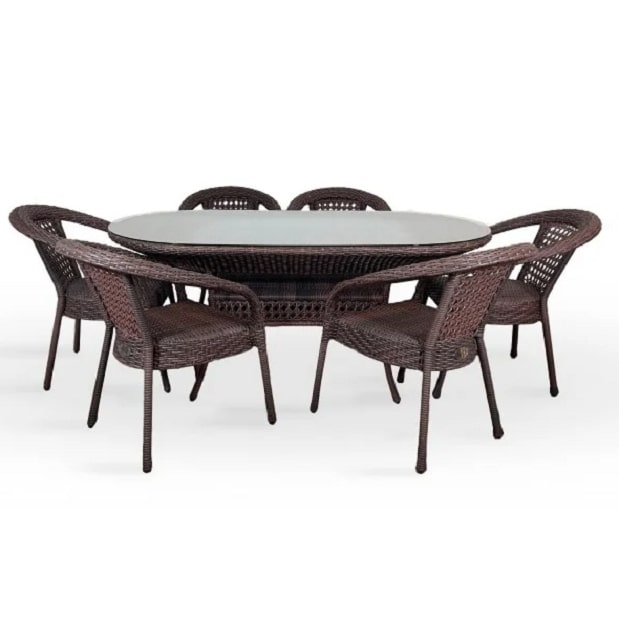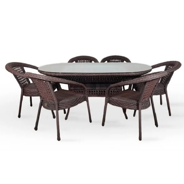 Комплект плетеной мебели из искусственного ротанга на 6 персон. Не боится влаги, прямых солнечных лучей, мороза. Не требует особого ухода. Легко моется. Рекомендованная температура эксплуатации -16/+50.В комплекте стол обеденный овальный, 6 кресел. Подушки можно приобрести отдельно. Столешница - каленое стекло 6 мм.