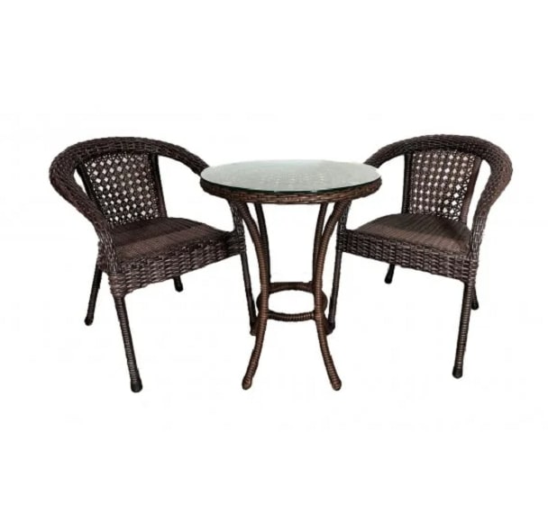 Комплект плетеной мебели из искусственного ротанга на 2 персоны. Не боится влаги, прямых солнечных лучей, мороза. Не требует особого ухода. Легко моется. Рекомендованная температура эксплуатации -16/+50. Нить плоская.В комплекте: стол д. 60 см, 2 кресла. Подушки можно приобрести отдельно. Столешница - каленое стекло 6 мм.