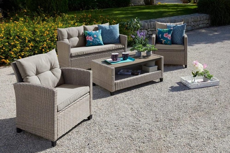 Идеально подходит для использования на улице и внутри помещения в любую погоду. Не боится воды, солнца и минусовой температуры. Подушки входят в комплект на диван и стулья.