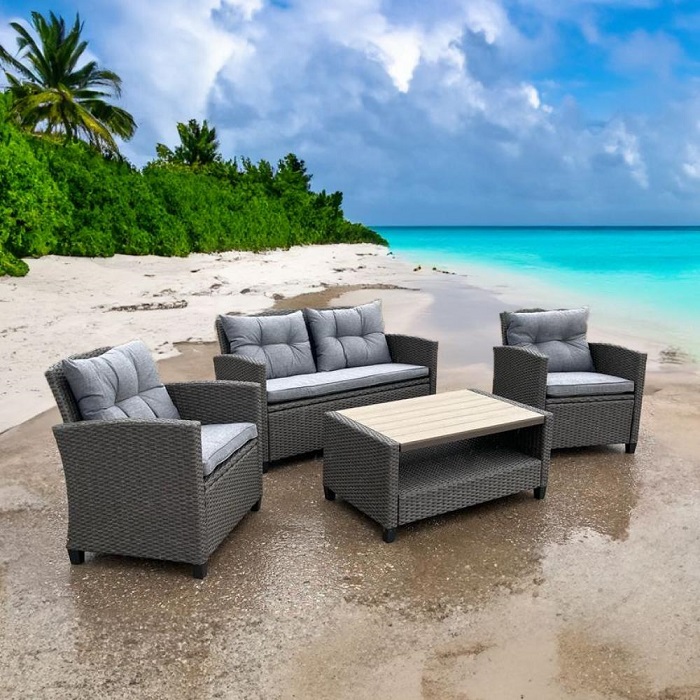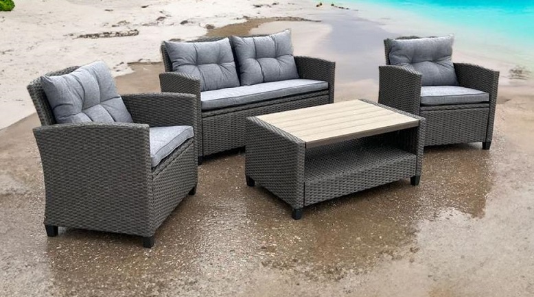 Идеально подходит для использования на улице и внутри помещения в любую погоду. Не боится воды, солнца и минусовой температуры. Подушки входят в комплект на диван и стулья.