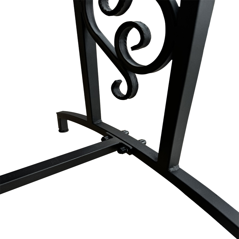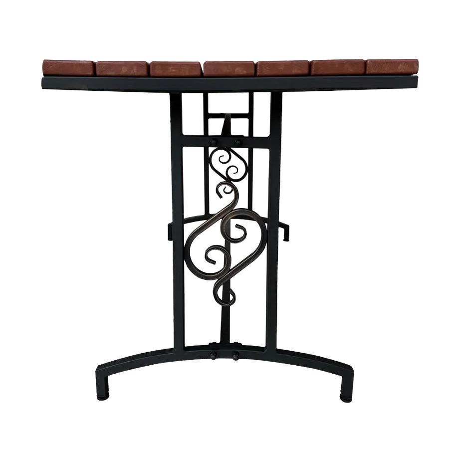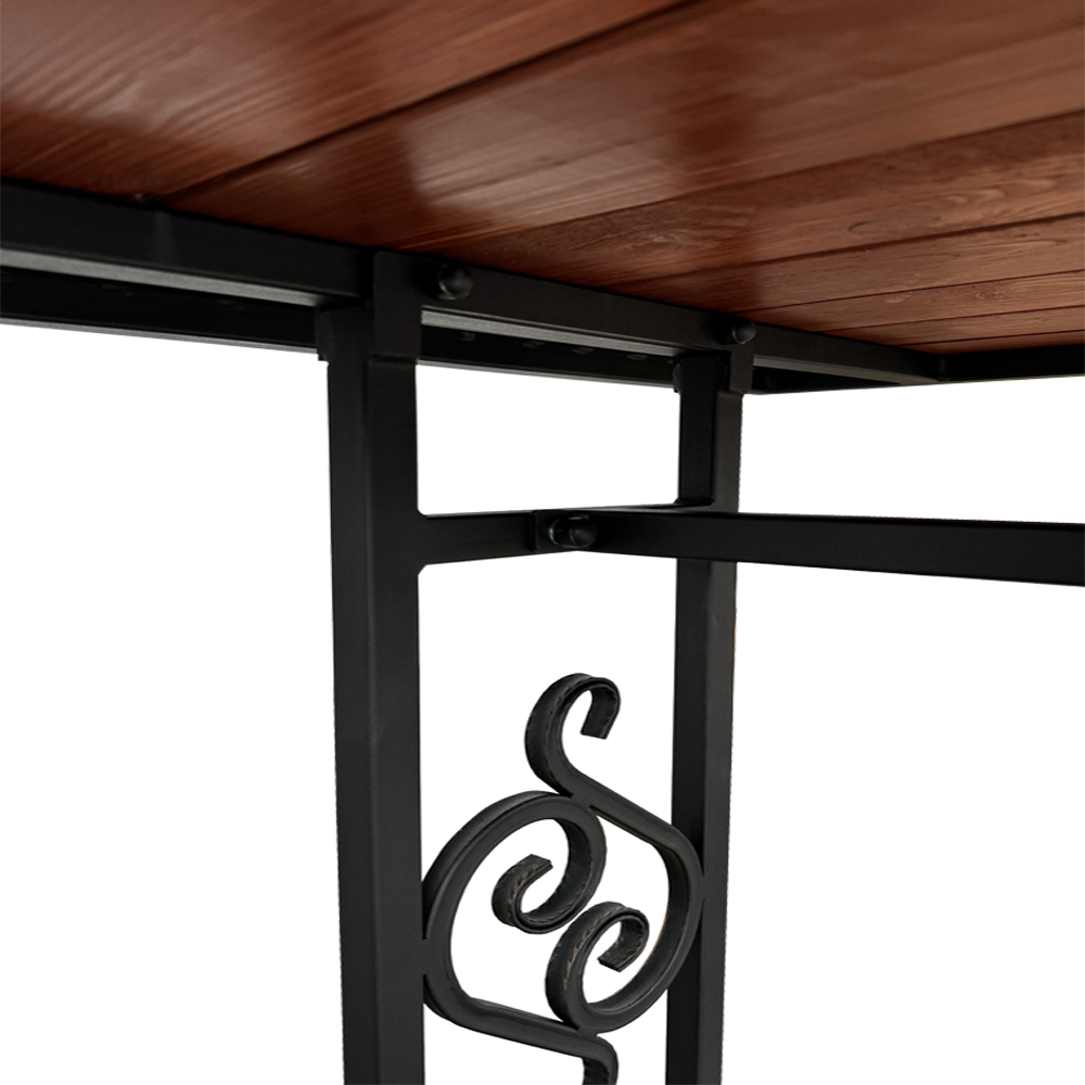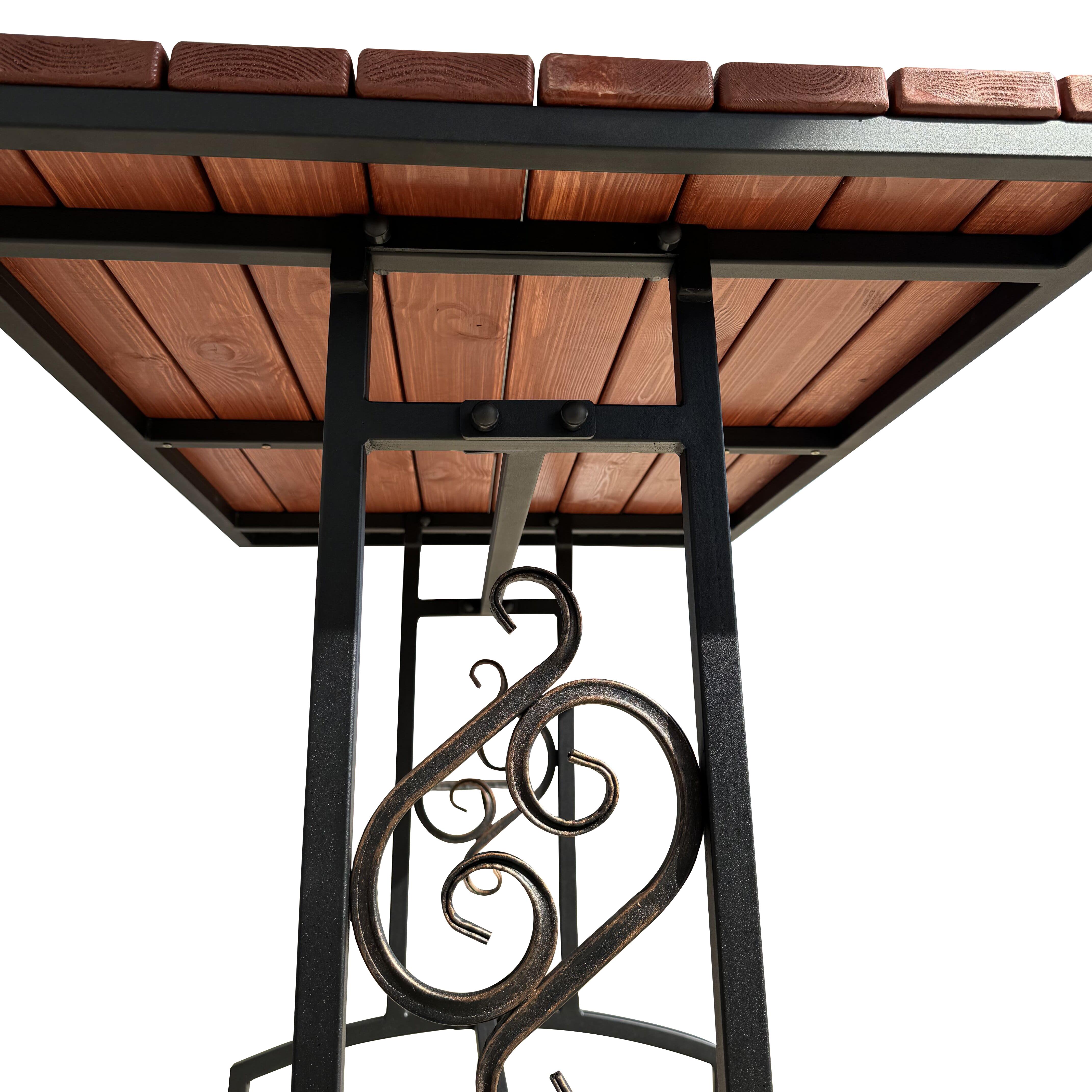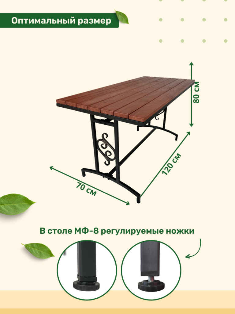 Стол садовый для дачи МФ-8 – это надежный и удобный стол для отдыха на свежем воздухе в вашем саду. Стол выполнен из стали, с коваными элементами покрытыми порошковой краской, которая обеспечивает ей долгий срок службы. Поверхность стола изготовлена из дерева с влагостойкой пропиткой в цвете махагон, которая приятна на ощупь и выглядит эстетично. Цвет каркаса и оттенок дерева гармонично сочетаются между собой, создавая универсальный вид садового стола. Модель имеет регулируемые ножки, что позволяет установить ее на любой ровной поверхности. Столешница легко крепится к каркасу болтами и гайками. Поставляется в разобранном виде. Надежные элементы крепления на болты с заглушками обеспечивают устойчивость конструкции и предотвращают ее повреждение влагой.