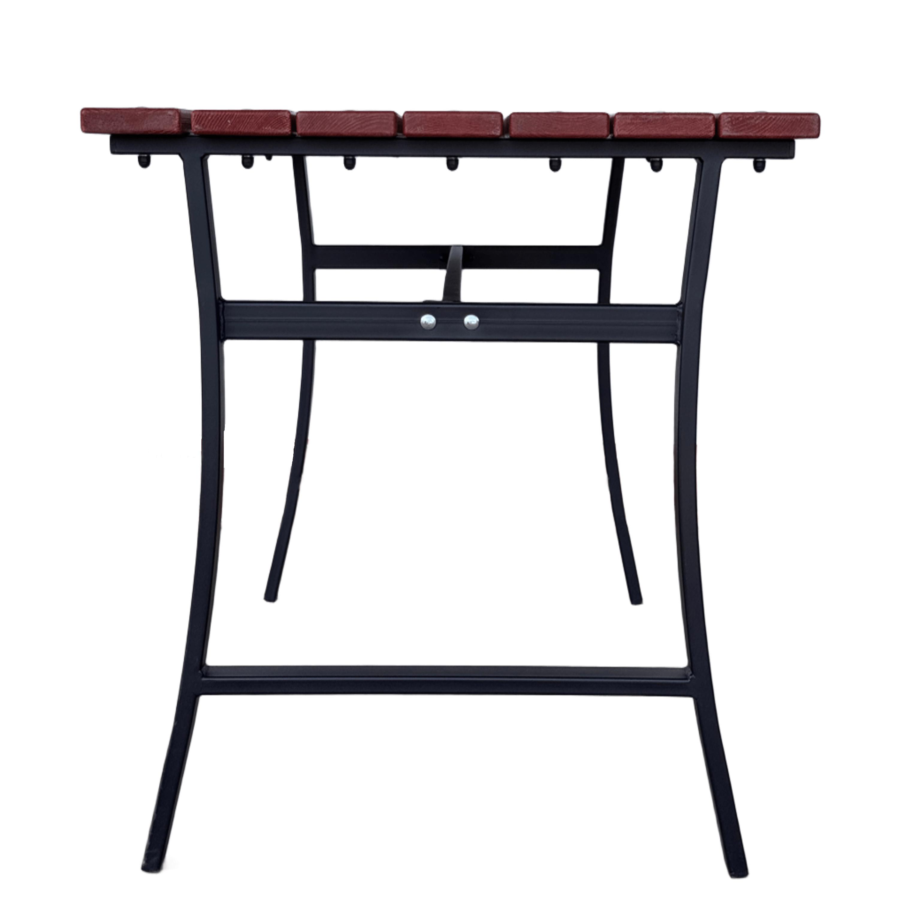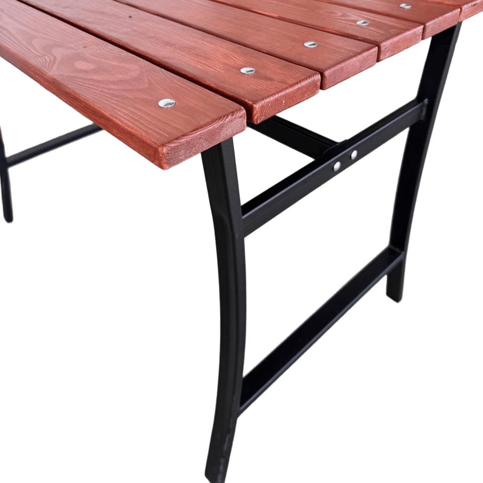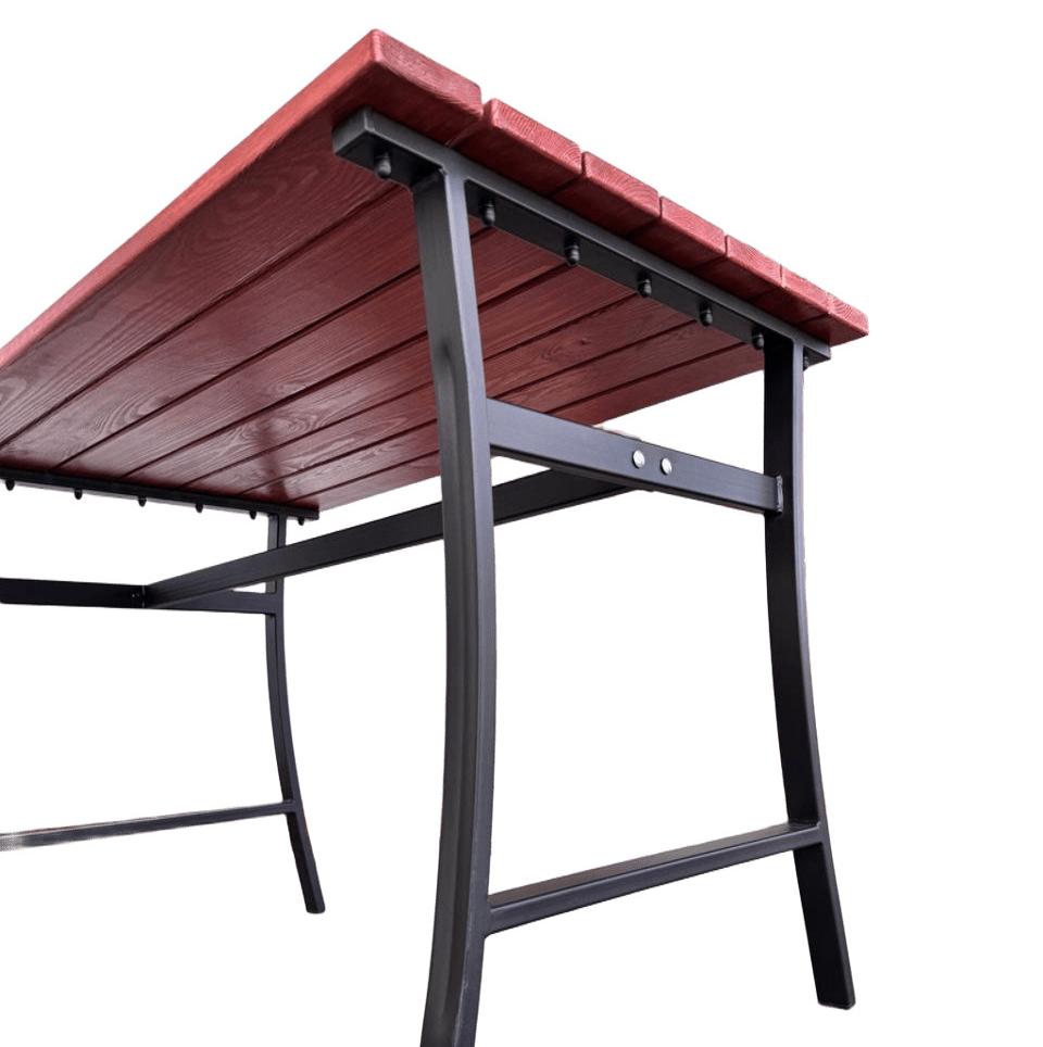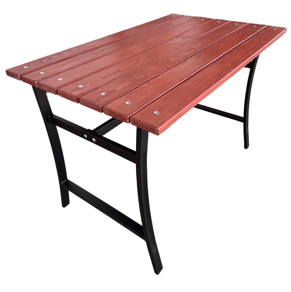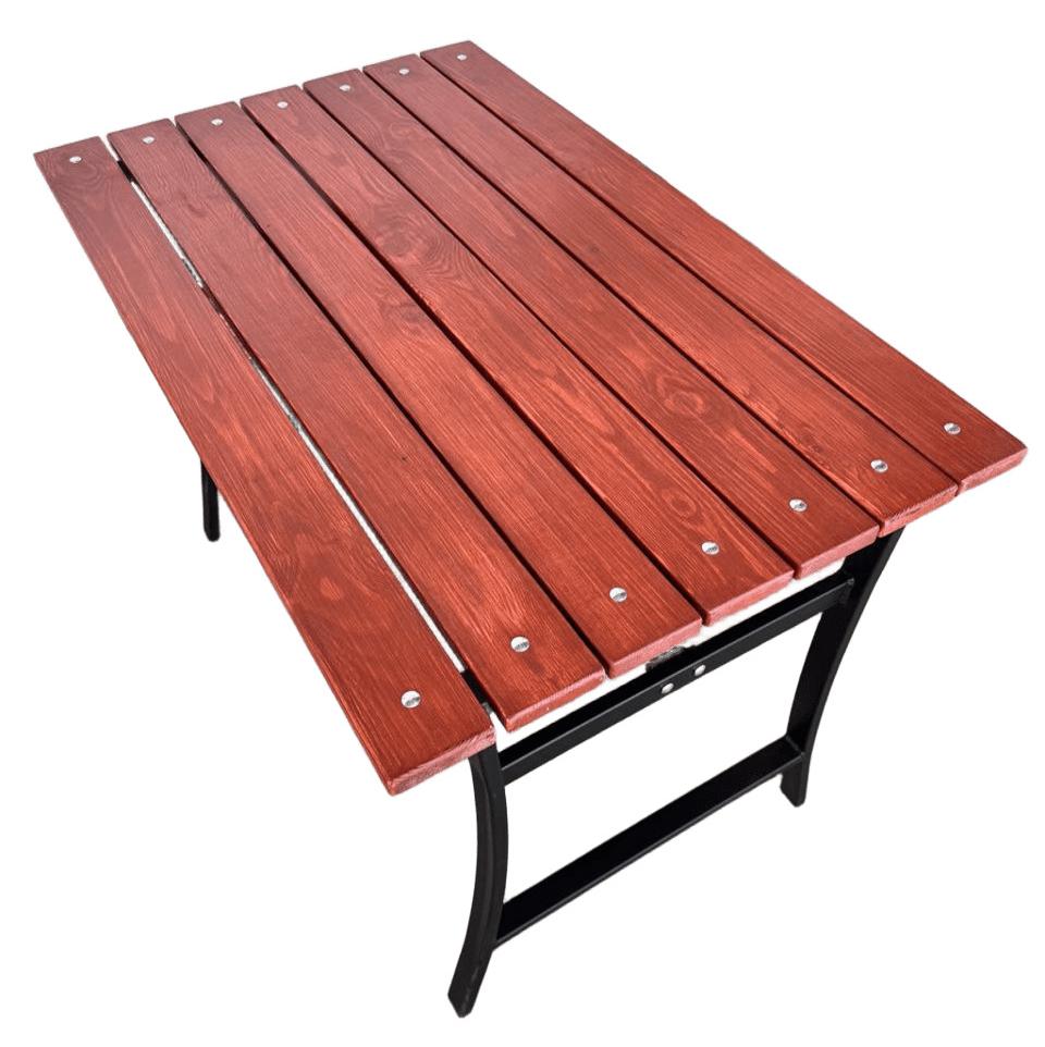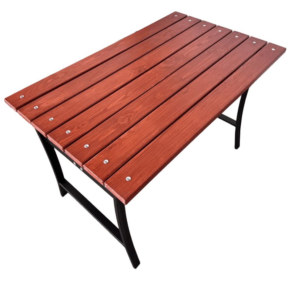 Стол садовый для дачи УНО – это надежный и удобный стол для дачи для отдыха на свежем воздухе в вашем саду. Стол выполнен из толстостенной стали, покрыт порошковой краской, которая обеспечивает ему долгий срок службы. Поверхность стола изготовлена из дерева с влагостойкой пропиткой в цвете махагон, которая приятна на ощупь и выглядит эстетично. Цвет каркаса и оттенок дерева гармонично сочетаются между собой, создавая универсальный вид садового стола. Столешница легко крепится к каркасу болтами и гайками.