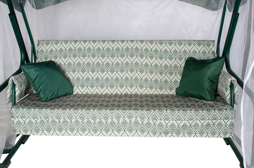 Качели Ренессанс порадуют эстетичной формой и станут удачным выбором модель выделяет прекрасное соотношение цены и качества. Зеленый каркас и зеленая обивка сидений прекрасно впишутся в ландшафт вашего сада.Преимущества: