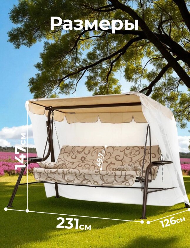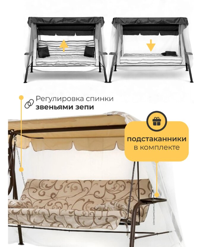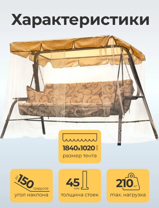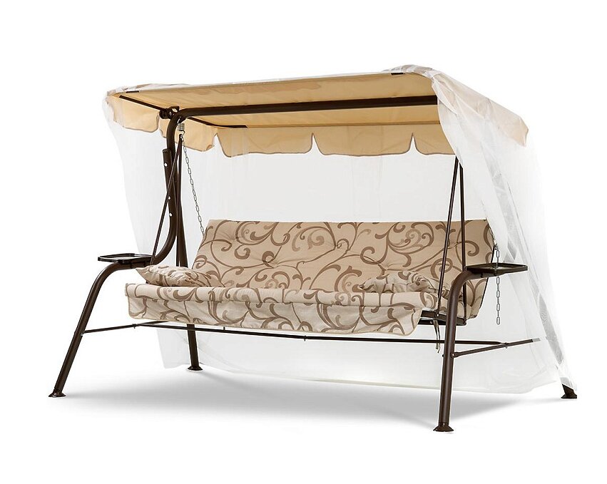 Основа сиденья выполнена из плетеной сетки, а мягкость создают слои полиэфирного полотна и аэрофома ;толщиной 50 мм. Обивка из смеси полиэстера и хлопка с плотностью до 111 г/м² в бежевом цвете с рисунком практична и приятна на ощупь. Дополнительный комфорт обеспечивают две подушки в комплекте. Спинку регулируют с помощью звеньев цепи.Тент из полиэстера плотностью 80 г/м² с размерами 184×102 см защищает от солнца. К тенту пришита противомоскитная сетка, что избавляет от надоедливых насекомых.
