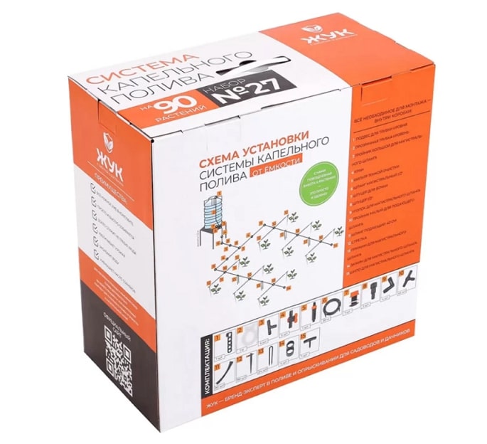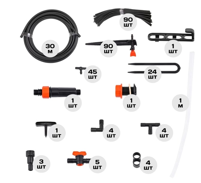 Комплектация набора: подвес для трубки уровня - 1 шт. трубка уровень прозрачная - 1 м тройник большой для магистрального шланга - 4 шт. кран - 5 шт. фильтр тонкой очистки - 1 шт. шланг магистральный - 30 м штуцер для бочки - 1 шт. штуцер 1/2" - 3 шт. уголок для магистрального шланга - 4 шт. тройник малый для подающего шланга - 45 шт. шланг подающий 40 см - 90 шт. регулируемая капельница - 90 шт. прижим для магистрального шланга - 24 шт. зажим для магистрального шланга - 4 шт. шило для магистрального шланга - 1 шт.