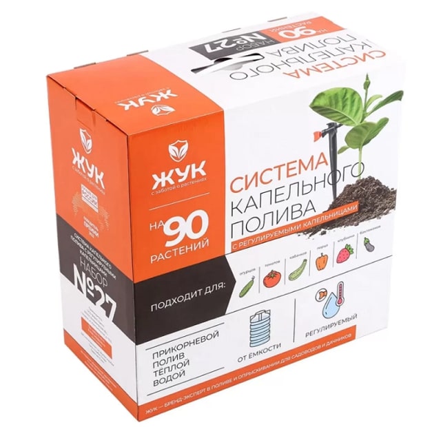 Капельный полив ЖУК от емкости 90 растений с регулируемыми капельницами используется для полива растений в парниках и теплицах, а также на открытом грунте.Данный полив работает от ёмкости при давлении от 0,1-0,2 атм. Расход воды на одну капельницу регулируется от 0 до 6-ти литров в час.