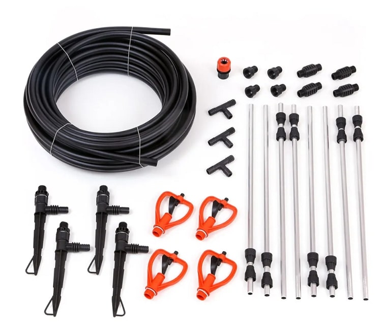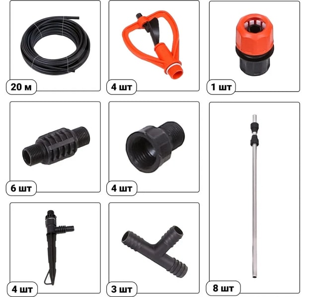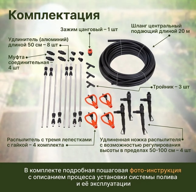 Комплектация набора: Шланг магистральный 1/2" - 20 м, цанговый зажим 1/2" - 1 шт., распылитель - 4 шт., гайка распылителя - 4 шт., соединительная муфта - 4 шт., алюминиевый удлинитель - 8 шт., ножка распылителя - 4 шт., тройник 1/2" - 3 шт.