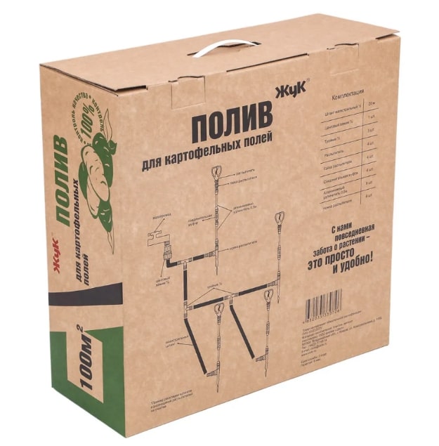 Комплект полива картофельных полей Жук предназначен для организации орошения участка площадью до 100 кв. м. Это прекрасное решение для полива посадок картофеля, а также газонов и клумб. В комплект входит всё необходимое для подключения системы к водопроводу и организации полива: шланг, фитинги, распылители.Радиус полива одного распылителя от 1 м до 3 м (в зависимости от установленной высоты распылителя и давления в системе).Используйте для полива только чистую воду. Для продления срока службы системы полива картофельных полей производитель рекомендует использовать фильтр для полива Жук. Он защитит систему от попадания мелкого мусора и предотвратит появление засоров.