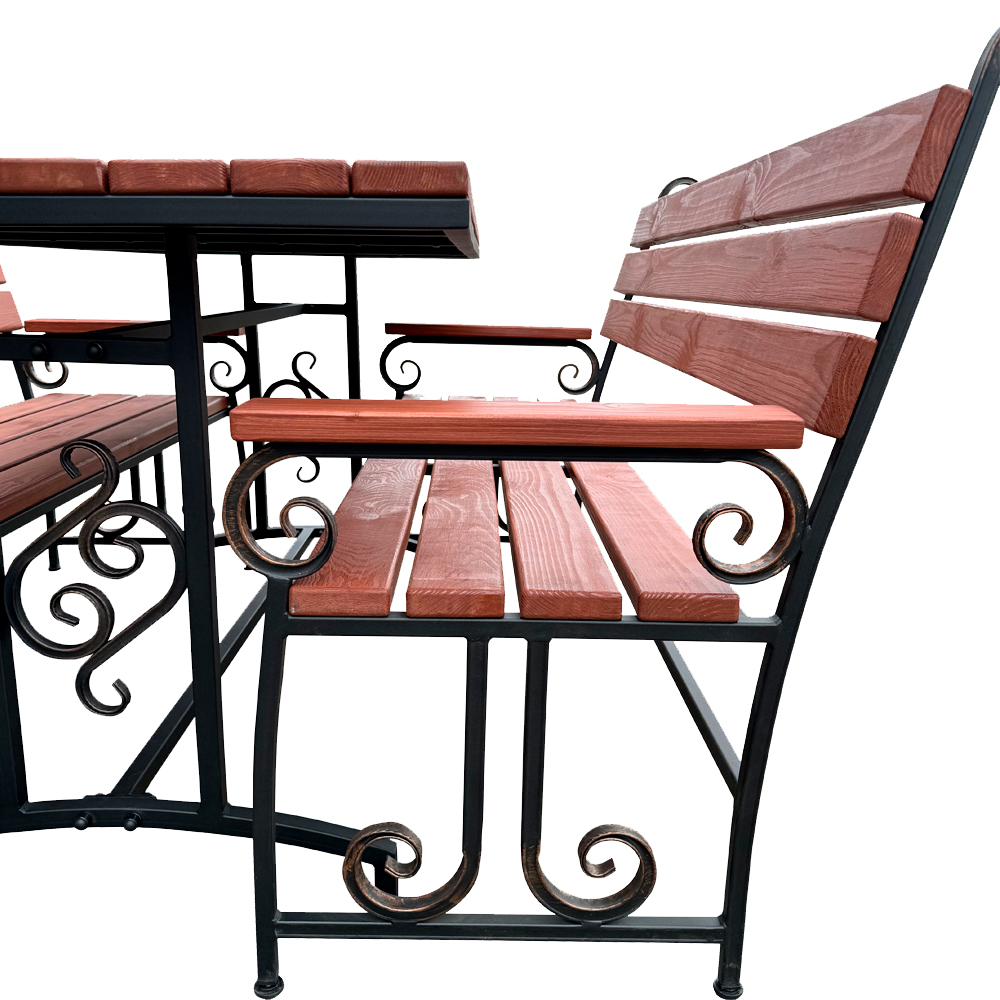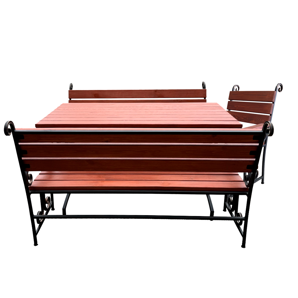 Компактный, кованый комплект Афина станет прекрасным дополнением экстерьера или интерьера различных архитектурных стилей, будет идеально удобен как на садовом участке, так и в уличных кафе и ресторанах.Скамья садовая и стол, входящие в состав набора представляют собой изящное сочетание металла и дерева.