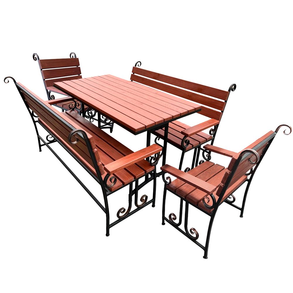 Компактный, кованый комплект Афина станет прекрасным дополнением экстерьера или интерьера различных архитектурных стилей, будет идеально удобен как на садовом участке, так и в уличных кафе и ресторанах.Скамья садовая, кресла и стол, входящие в состав набора представляют собой изящное сочетание металла и дерева.