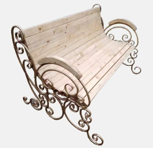 Скамейка для сада форма сиденья прямоугольная 2000х400 мм, форма спинки прямоугольная 2000х400 мм, высота сиденья 450 мм, материал столешницы натуральное дерево сосна, материал опор сталь (электросварная труба д.16 д.10)Великолепная кованая скамейка из металла и дерева предаст изящность и дополнит Ваш уют. Ажурная ковка из металла придает изящества и утончённость, такая скамья станет украшением Вашего сада.