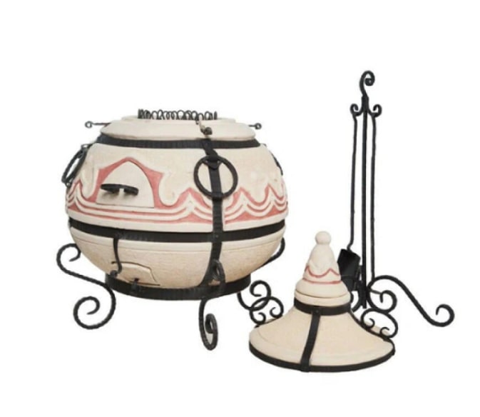 Комплектация тандыра: кочерга, шампуры, подставка под шампуры, совок, держатель шампуров, колосник, стойка.