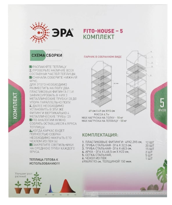 Комплект для успешного выращивания растений в домашних условиях в любой сезон. ЭРА FITO-House-5 — это простая в сборке и очень компактная теплица из металла + 5 линейных фитосветильников для каждого яруса.
