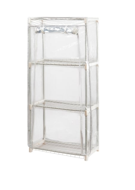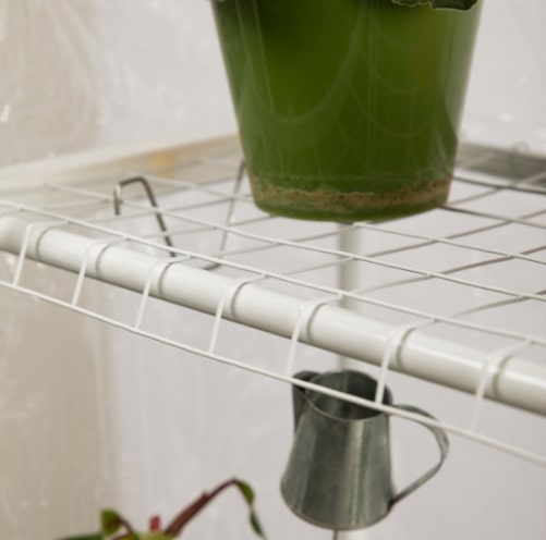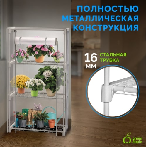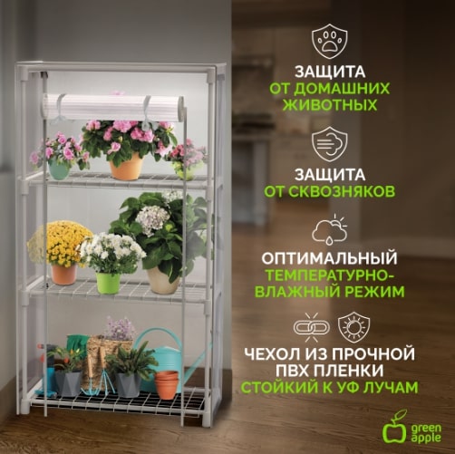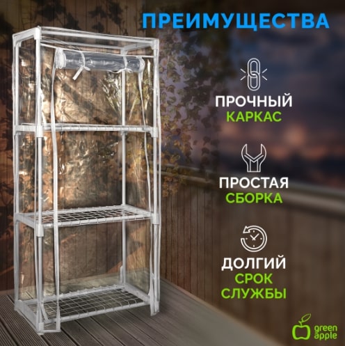 Качественный и надёжный металлокаркас дополняет прочный прозрачный кожух с удобной молнией. Кожух защищает растения от сквозняков, создаёт внутри теплицы необходимый для быстрого развития растений микроклимат. Благодаря молнии кожух легко открывается для проветривания, полива, замены ящиков или горшков.