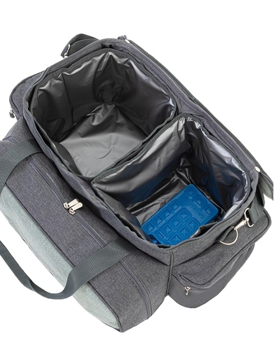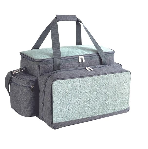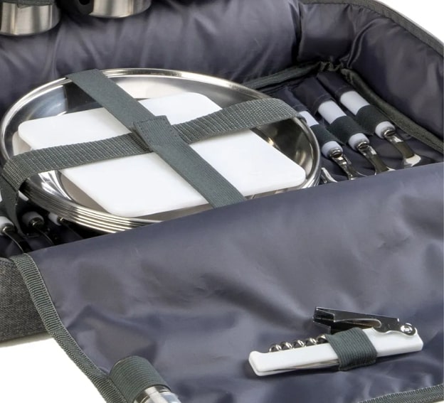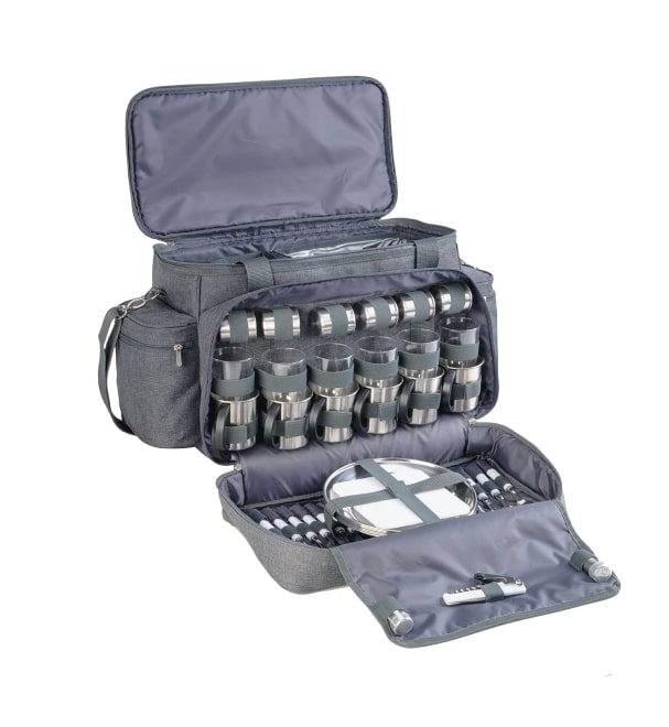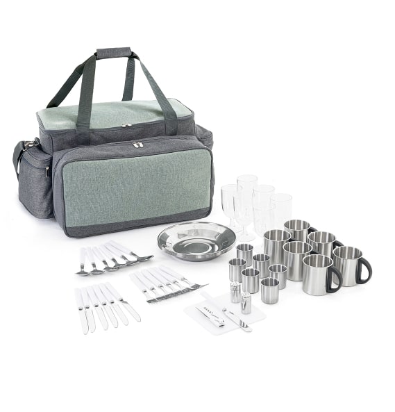 Изотермическая сумка-холодильник объем: 11+13 л Количество предметов в сумке на 6 персон: 47 предметов (ножи, вилки, ложки, чашки, стаканы, рюмки, тарелки, солонка, перечница, штопор, нож для сыра/масла, разделочная доска)