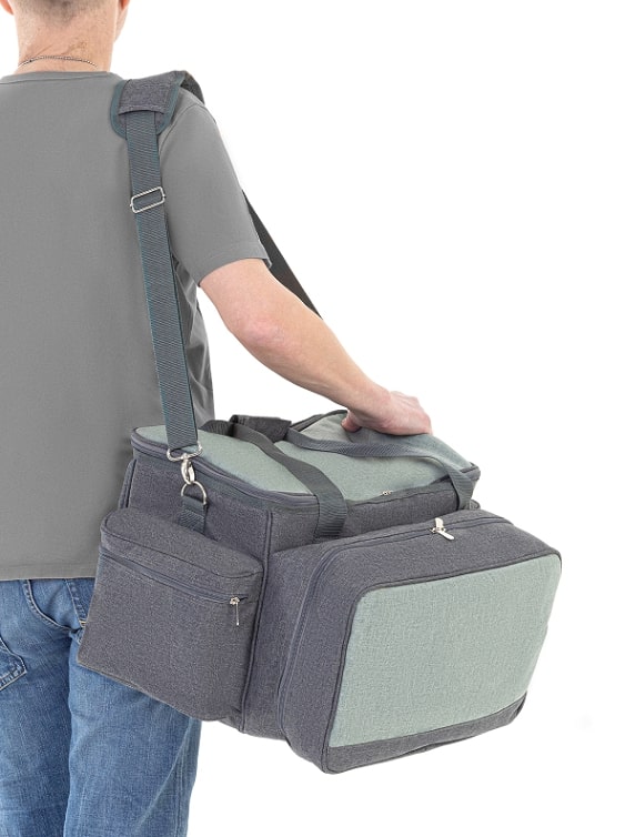 Сумка туристического набора для пикника и гриля выполнена из прочной ткани меланж 600D + изоляция PEVA + подкладка из полиэстера 210D полиэстер с качественной прошивкой. Имеет надежные молнии, удобные ручки и регулируемый по длине плечевой ремень, с помощью которого ее легко и удобно нести.