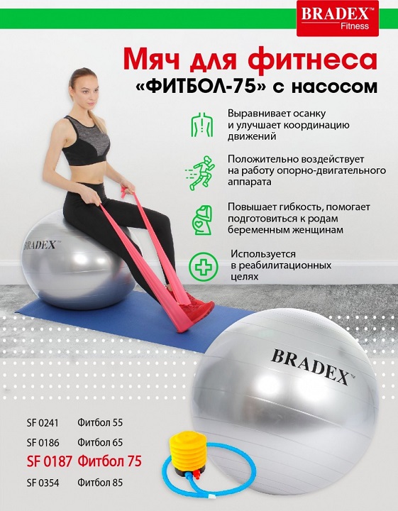 Комплектация: мяч для фитнеса, насос-лягушка, инструкция по применению.